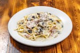 Pancetta, mushrooms, black olives, and garlic sauteed in a creamy white sauce over fettucini pasta.
